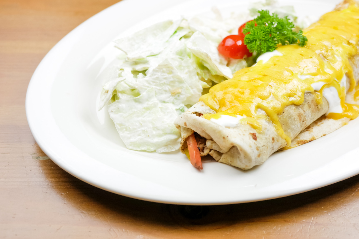Whole wheat spinach wrap, 1 whole egg, 2 egg whites, onion, tomatoes, fat-free feta cheese and guacamole.
